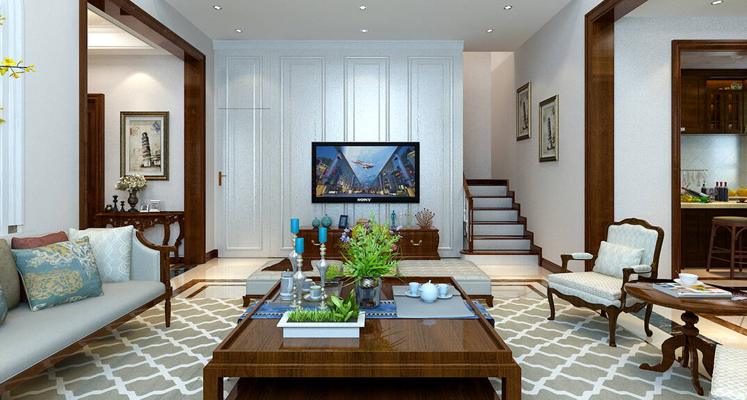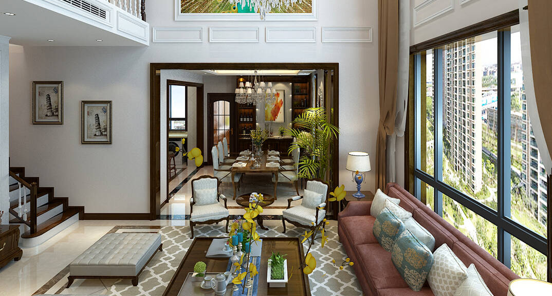 銀盛泰德郡260㎡別墅復(fù)式客廳走廊新中式風(fēng)格裝修案例效果圖