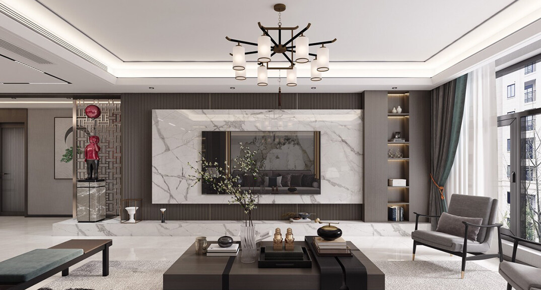 綠城·海棠印月166㎡三室二廳客廳新中式風(fēng)格裝修案例效果圖