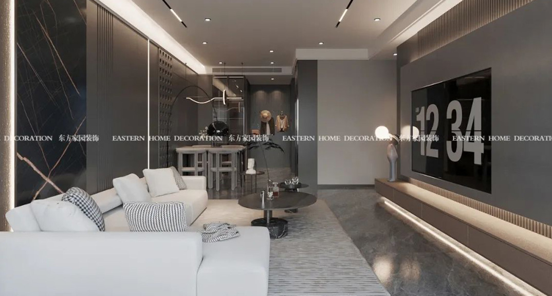 盛世華府129㎡三室兩廳客廳現(xiàn)代極致黑風格裝修案例效果圖