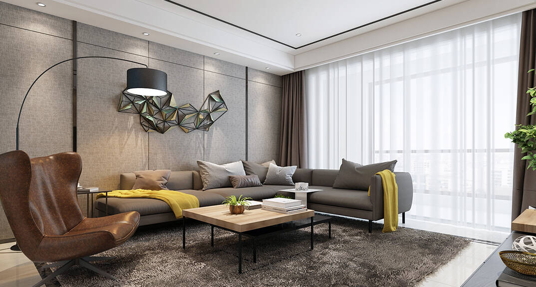 客廳體現(xiàn)了主人的品味,地位,也是交友娛樂的場合,影視墻凹凸線條的護墻板很好的隱藏了孝親房的門讓整個空間融為一體。