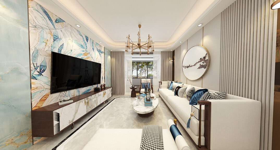 青安·海悅居86㎡二室二廳客廳新中式風格裝修案例效果圖