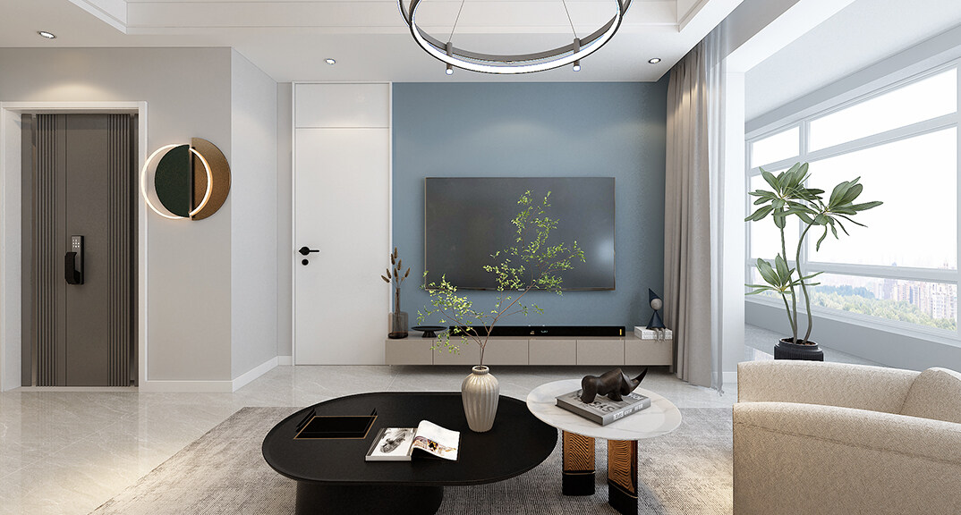 越秀天悅海灣97㎡三室一廳客廳電視現(xiàn)代輕奢風(fēng)格裝修案例效果圖